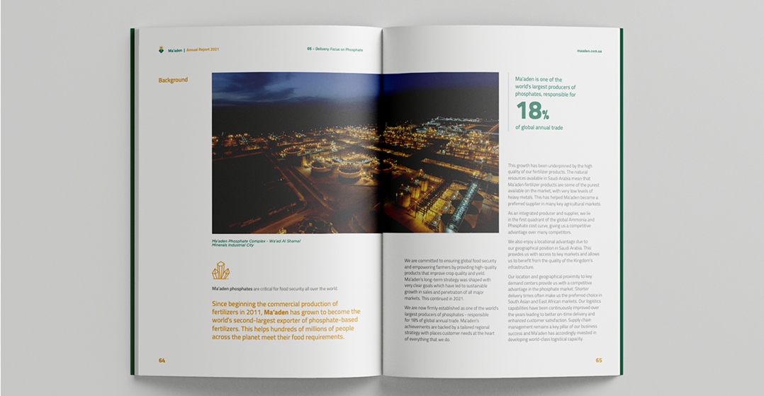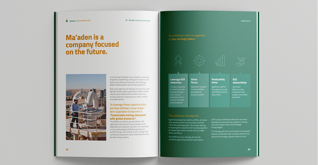 that highlighted Their growth while staying true to their core values of sustainability and integrity. Our purpose was to present Maaden's growth in 2021, emphasizing their adherence to strong values and responsible mining practices.