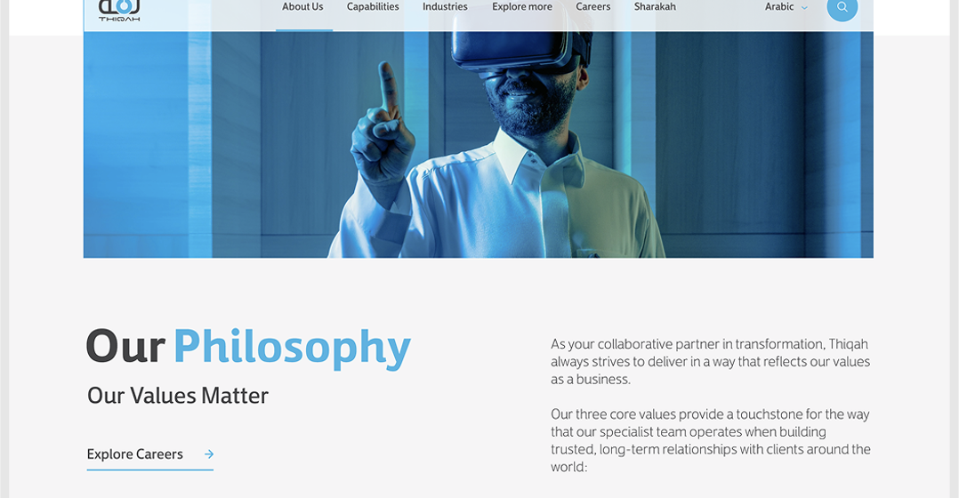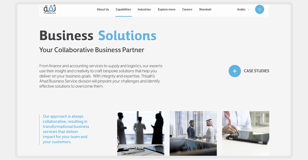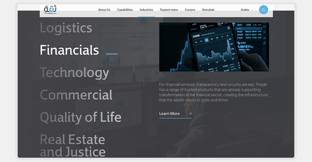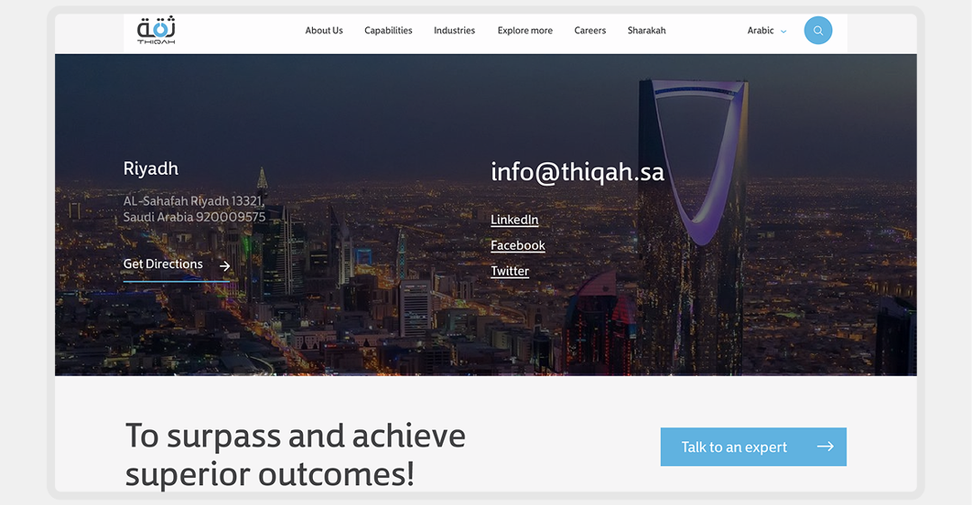 its leadership in government and corporate solutions. The existing website was outdated and lacked intuitive navigation. Our purpose was to create a user-friendly, interactive platform that elevated Thiqah's digital presence and catered to diverse stakeholders.